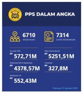 Per Jumat (21/1) Negara memperoleh uang tebusan sebesar Rp572,71 miliar dari Program Pengungkapan Sukarela (PPS) atau Tax Amnesty Jilid II. Angka tersebut berasal dari setoran pajak penghasilan (PPh) yang didapat dari pengungkapan harta bersih senilai Rp5,25 triliun.